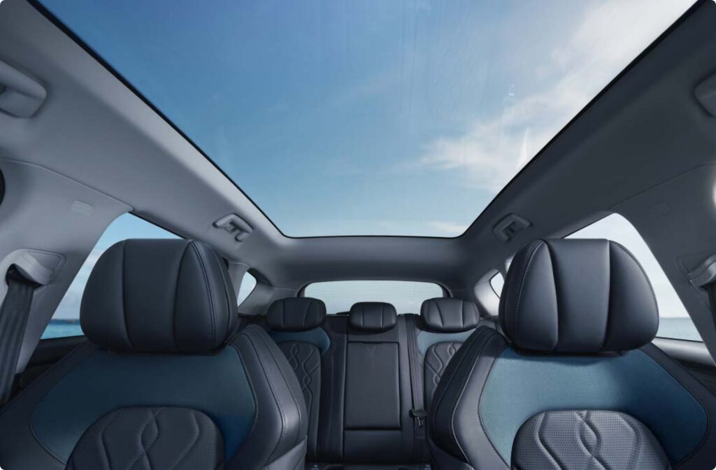 Panoramataket i VOYAH FREE gir en god følelse av åpenhet. Det kan dimmes fra en av skjermene så du ikke blir blendet av sola på dagtid.