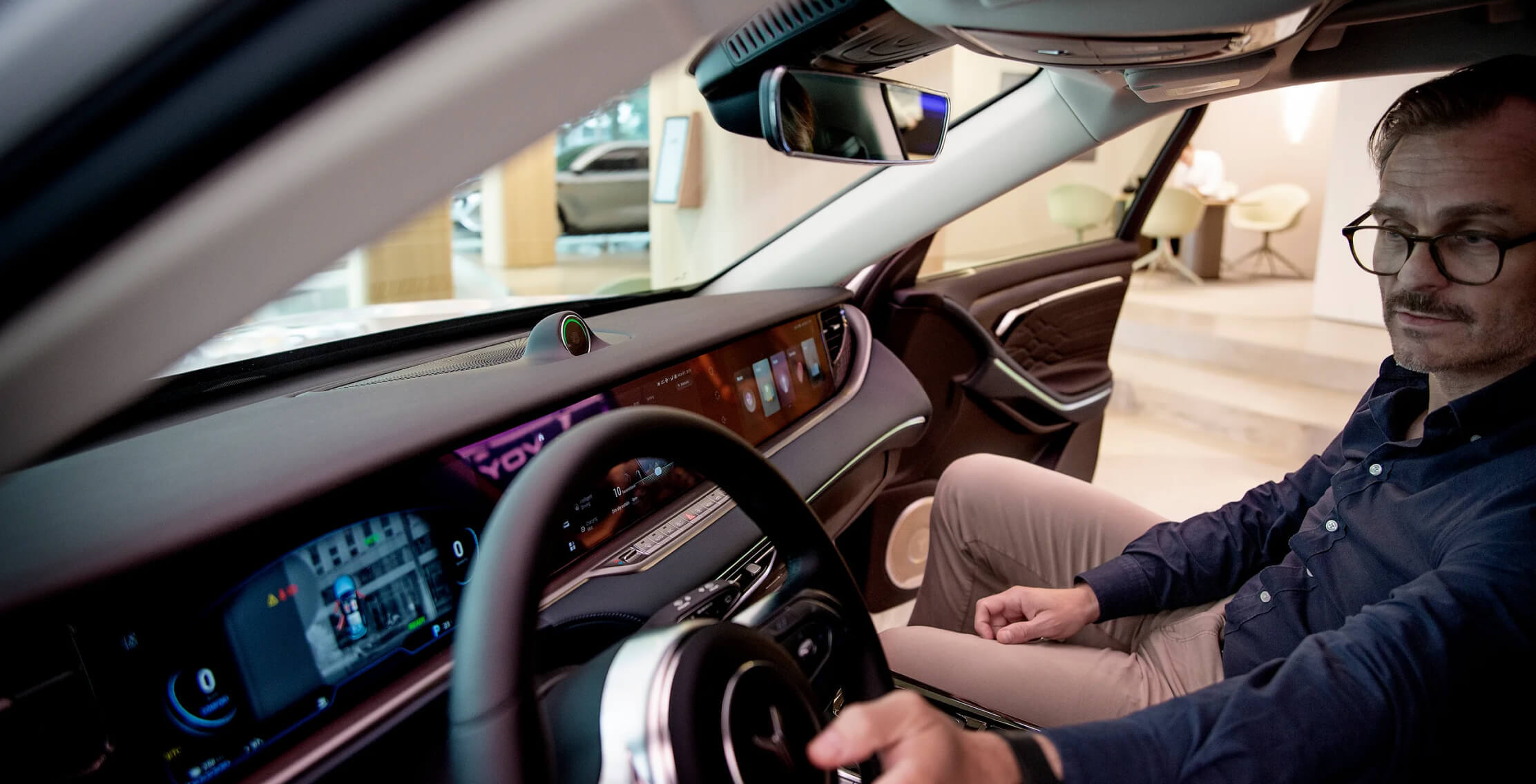 – De to små guttene i familien er kanskje litt skuffet over at det ikke er tilsvarende skjermer i baksetet, men det er nok av lademuligheter og veldig god plass der. Bilen er så romslig at den kunne vært designet for dem som har sjåfør og sitter bak, sier han og peker på et grønnlysende kamera midt på dashbordet.