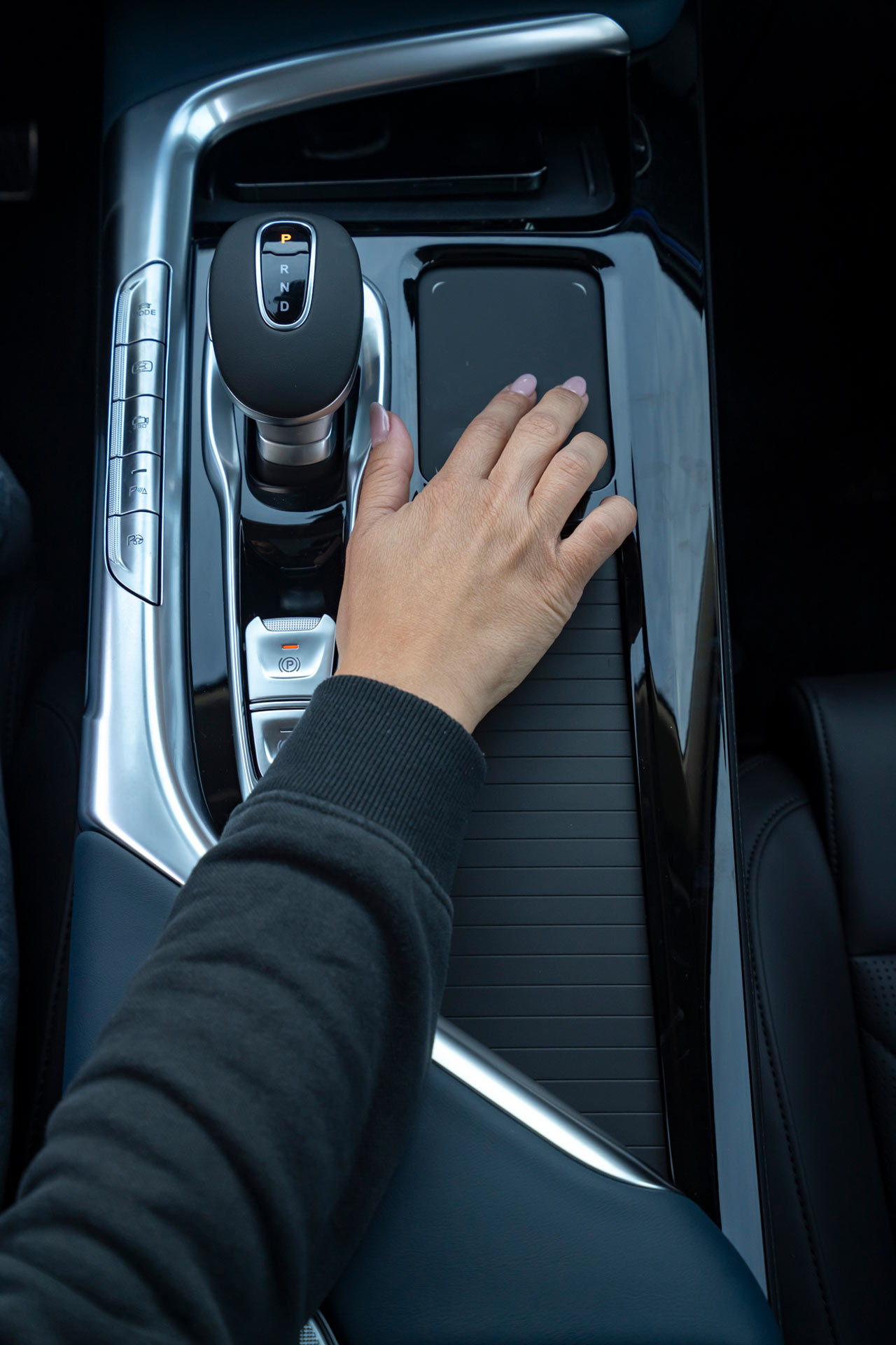 I midtkonsollen har du god plass til oppbevaring, du kan lade mobilen din trådløst og styre noen av funksjonene på skjermene.